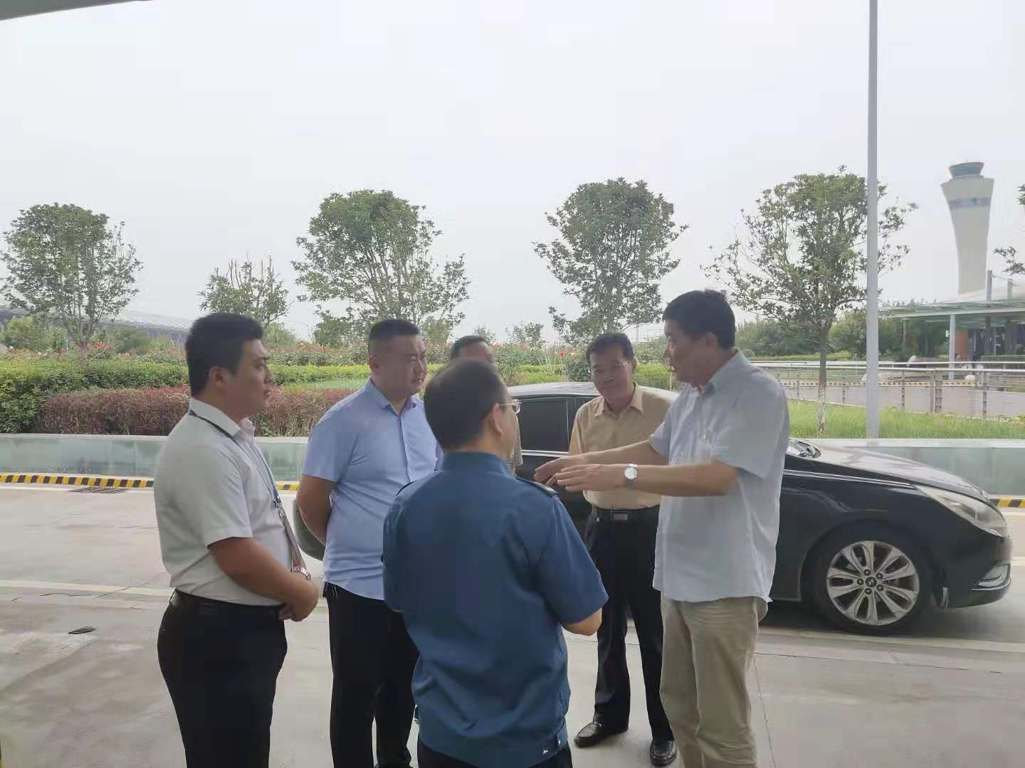 结束考察前曹书记及各领导在出租车侯客点与出租车管理站站长张强及执法支队机场大队队长柳立新进行亲切交谈,并对管理站提出建议,并对管理站下一步工作作出指导,并希望管理站继续不断创新,提高管理水平,提升郑州机场停车智慧化建设,争做行业标杆,发挥良好的行业带头人作用。